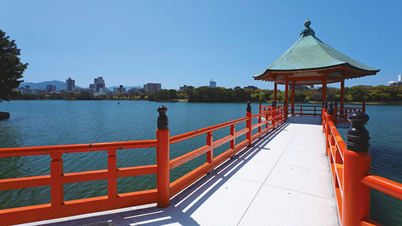 커다란 연못과 나무 그늘 아래 앉아 쉬기 좋고, 인근에는 후쿠오카 성터도 있어서 간단히 둘러볼 수 있어요.